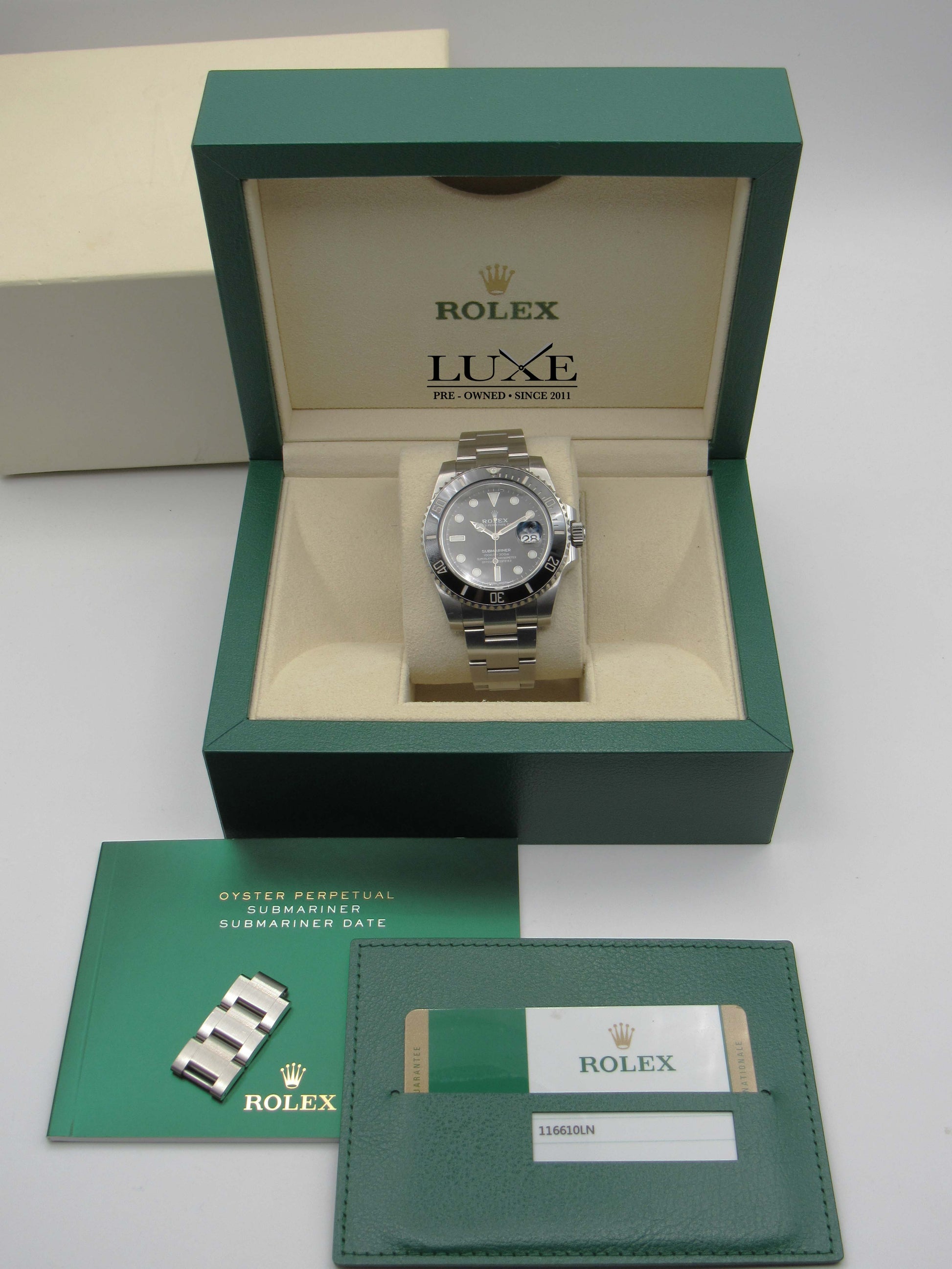 El Rolex 116610LN, también conocido como "Submariner Date", es un reloj submarino de alta gama que se presentó como una actualización del modelo anteriormente mencionado, el 16610. Este reloj cuenta con una caja de 40mm de acero inoxidable Oystersteel y un cristal de zafiro resistente a rayones, lo que le otorga una construcción sólida y duradera.